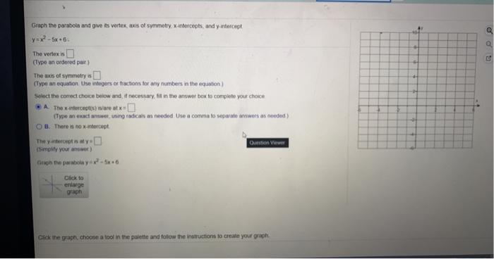Y=x^2-5x 6 parabola- Finding the yintercept of a parabola can be tricky Although the yintercept is hidden, it does exist Use the equation of the function to find the y intercept y = 12 x 2 48 x 49 The yintercept has two parts the xvalue and the yvalue Note that the xvalue is always zero So, plug in zero for x and solve for y y = 12 (0) 2 48 (0) 49 (Replace x with 0) where ( h , k ) are the coordinates of the vertex and a is a constant for a parabola in standard form y = ax2 bx c xvertex = − b 2a y = x2 − 5x −6 is in standard form with a = 1,b = − 5,c = − 6 ⇒ xvertex = − −5 2 = 5 2 substitute this into the equation for ycoordinate ⇒ yvertex = (5 2)2 −5( 5 2) −6 = − 49 4 ⇒ vertex = ( 5 2, − 49 4)